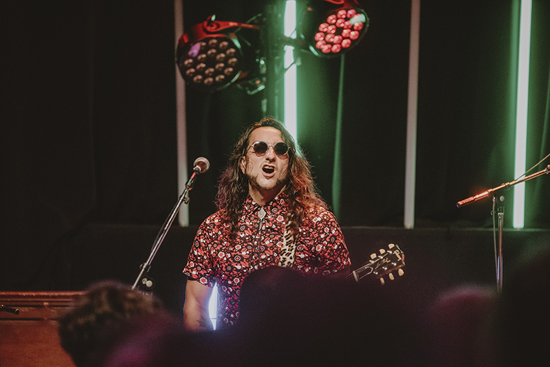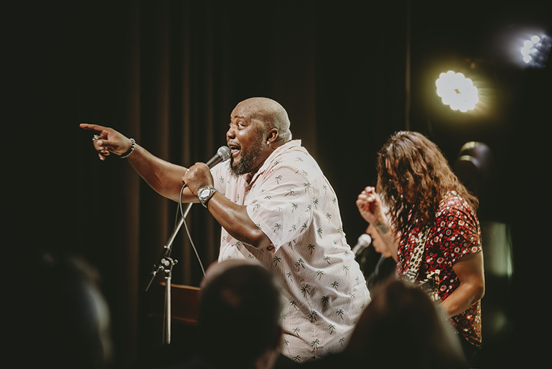 “We became a band this morning,” Pouponneau laughed and told the crowd they had to come up with songs to perform together that morning. The audience was quiet at first but as he continued to tell stories and talk to the crowd, the crowd began to talk back. Audience interaction became a big part of their show as they moved from song to song and then decided it was time to create a new song live. They collected a variety of words one at a time (surprisingly tame words), and he freestyle rapped as the audience cheered for his quick delivery.