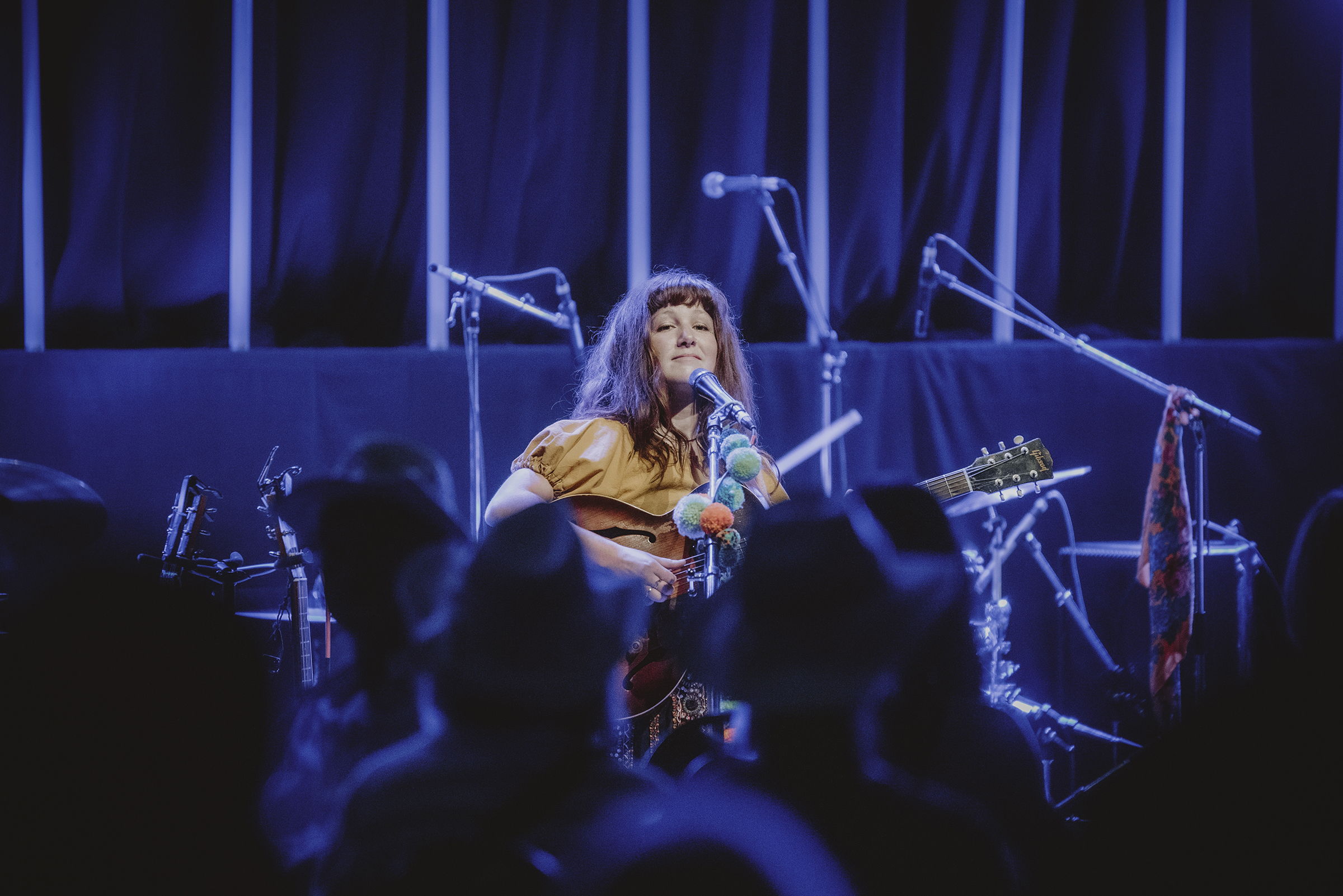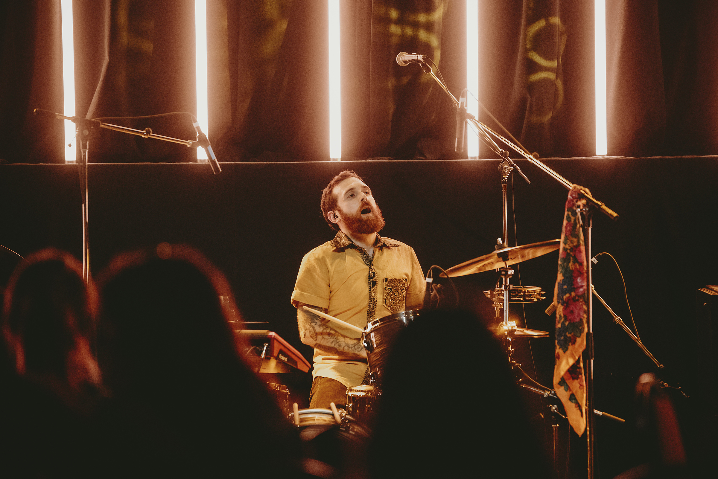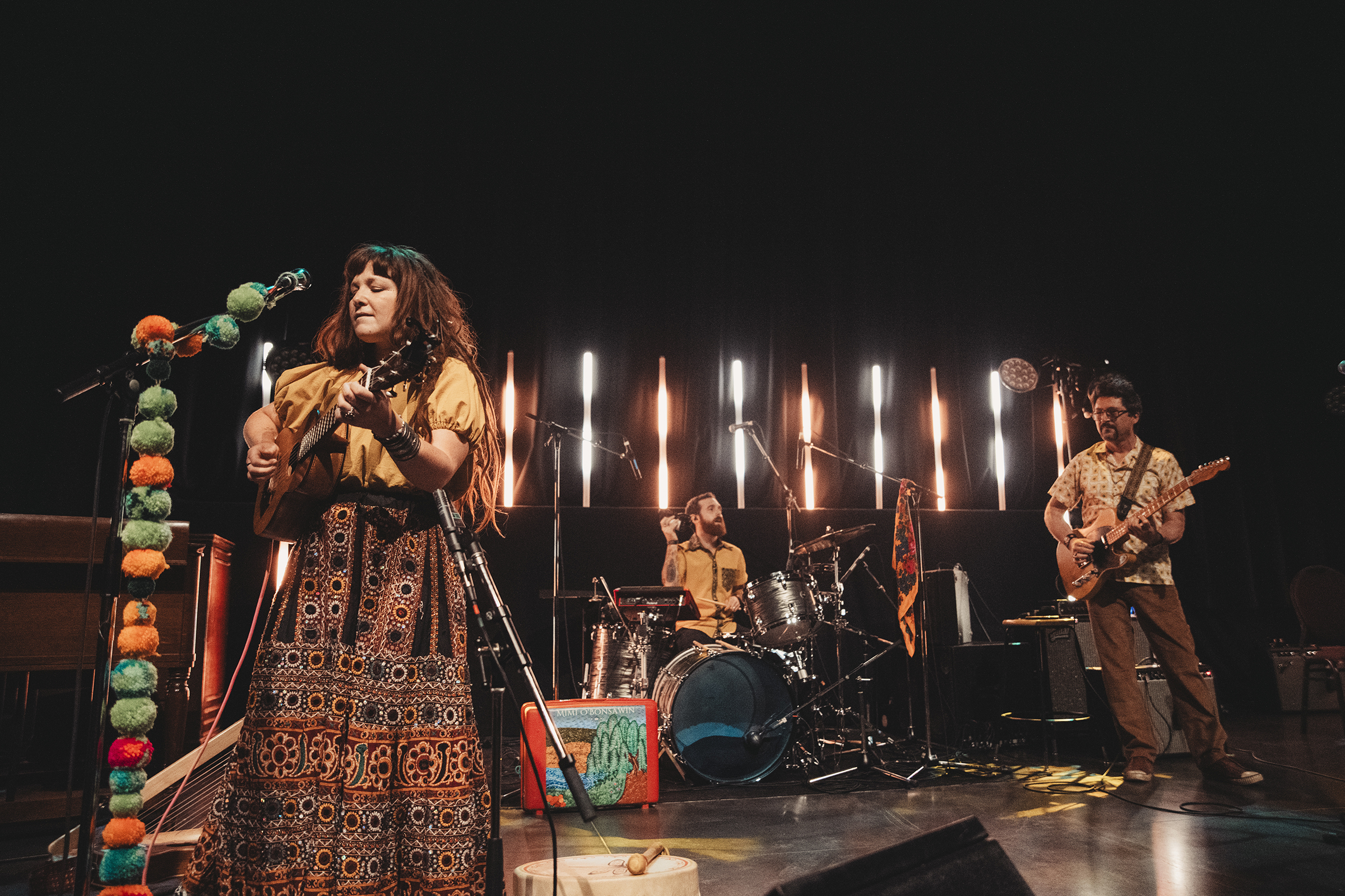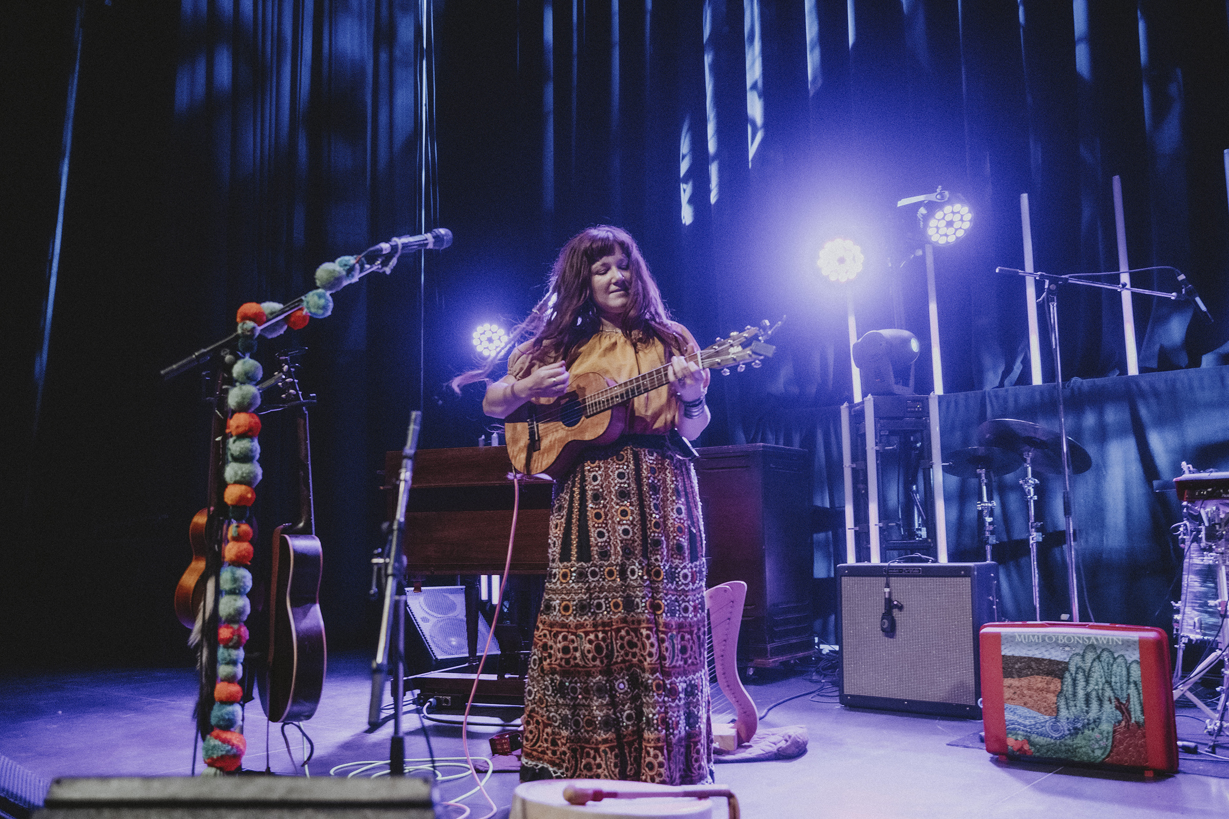 O’Bonsawin lit up the dark room with her ethereal energy and ear to ear smile as she sang, hummed, and howled. Her voice and songs held real magic as they transported the crowd to a lush forest with birds chirping and the flow of a nearby river. The “jingly jinglies” (as she called it) of her skirt, the masterful drums and guitar by her bandmates, and the backing tracks made for a perfectly unique and delightful hour.