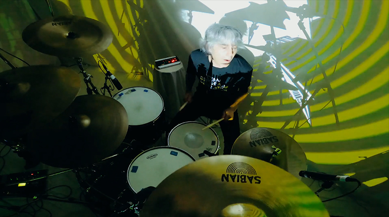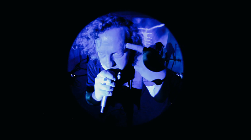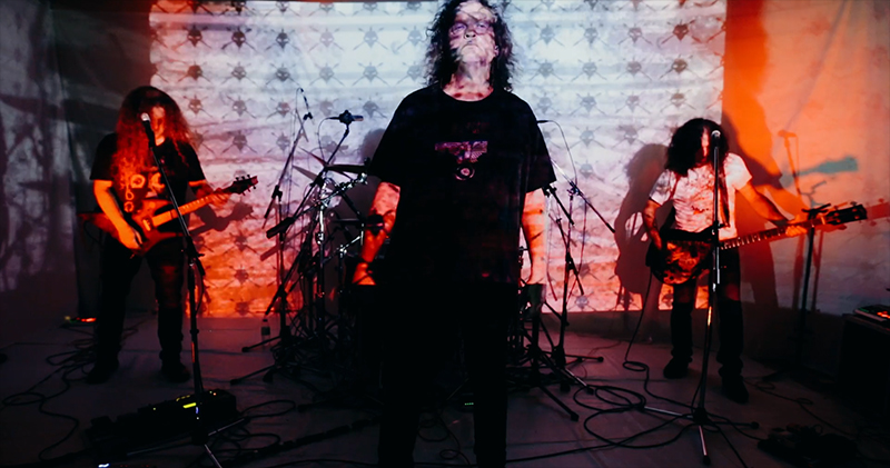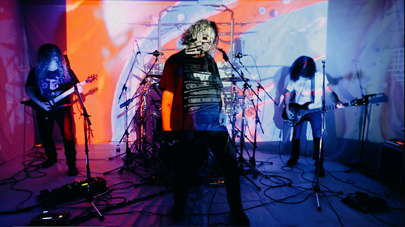 The setting was a dimly lit room that looked and felt as if hanging out with les boys as they jammed in their practice space. A projector sprayed images and shapes across the faces of the members, which gave off a pretty trippy vibe – one that encompasses the music quite well. At times, the camera work was as disharmonic and as chaotic as the music itself. Inverting colors, syncing in random images, that sort of lark. The camera constantly went in and out of focus, which at first was annoying but as time wore on – felt almost intentional and somehow fitting and appropriate. After all, the music Voivod has been crafting through all these years does the same sort of thing, only sonically.