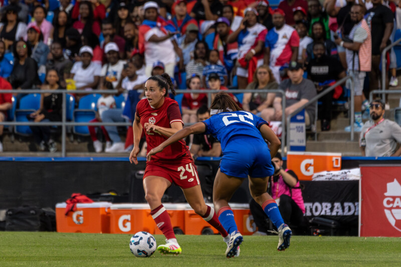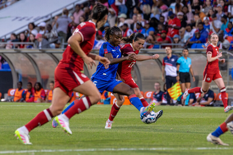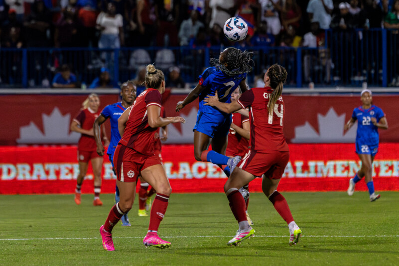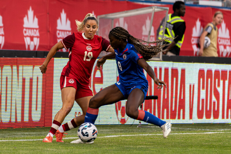 Great chances from Louis Batcheba were troubling Canada’s back line considerably. Batcheba had a shot from inside the box sosred over the cross bar and Gabrielle Carle was forced to slide to block a golden opportunity from Sherly Jeudy. Melchie Dumornay constantly found ways to break in on Canada’s goal, and was proving to be more and more dangerous as the game rolled on.