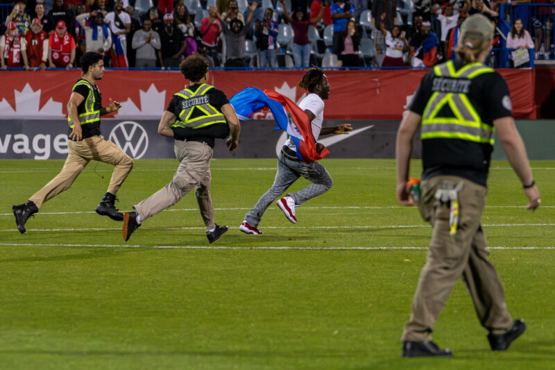 There were several instances of pitch invaders jumping down onto the pitch, giving the Stade Saputo security team a work out as they raced to tackle the naughty fans – one of whom stopped to hug Haiti’s Roseline Eloissaint, while another fan hopped over the barrier and lead the security guards on a chase with his Haiti’s flag waving proudly behind him. Soon enough, despite some fancy footwork, he ran out of room and was tackled down to the ground, and escorted away.