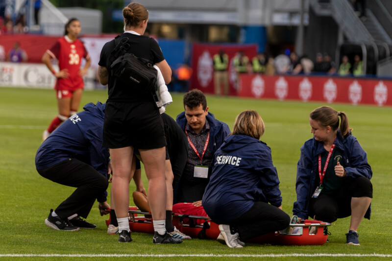 There was a scary moment early on, as Haitian defender Batcheba Louis went to clear the ball, which struck the head of Canadian defender Olivia Smith, leaving her motionless on the grass, and needing medical attention. Eventually Smith, who plays for Liverpool FC in England, and had just been named the 2024 Young Player of the Year in a ceremony prior to the start of the game, had to be carried off on a stretcher but appeared to be awake and responsive.