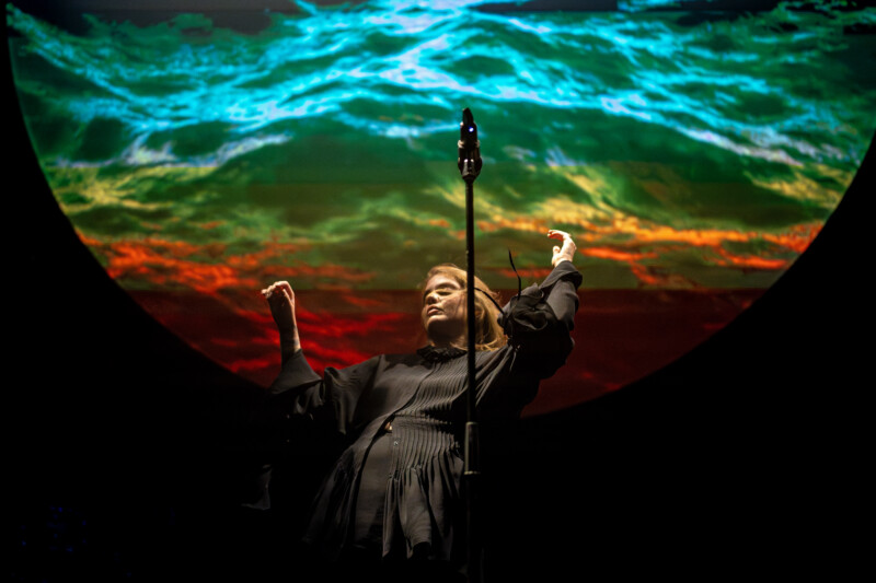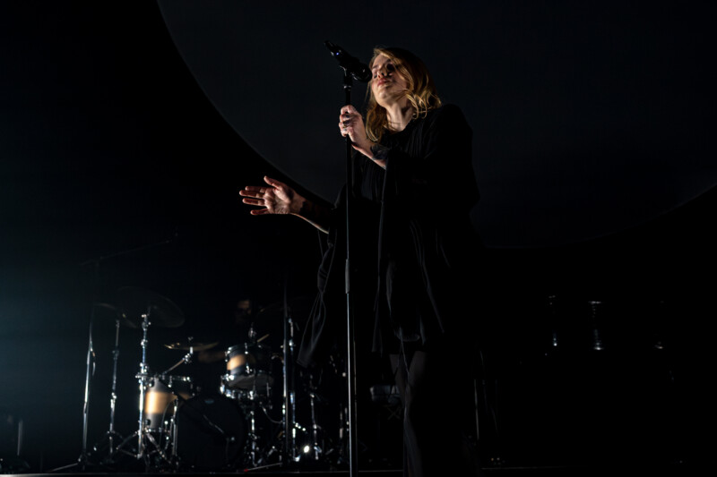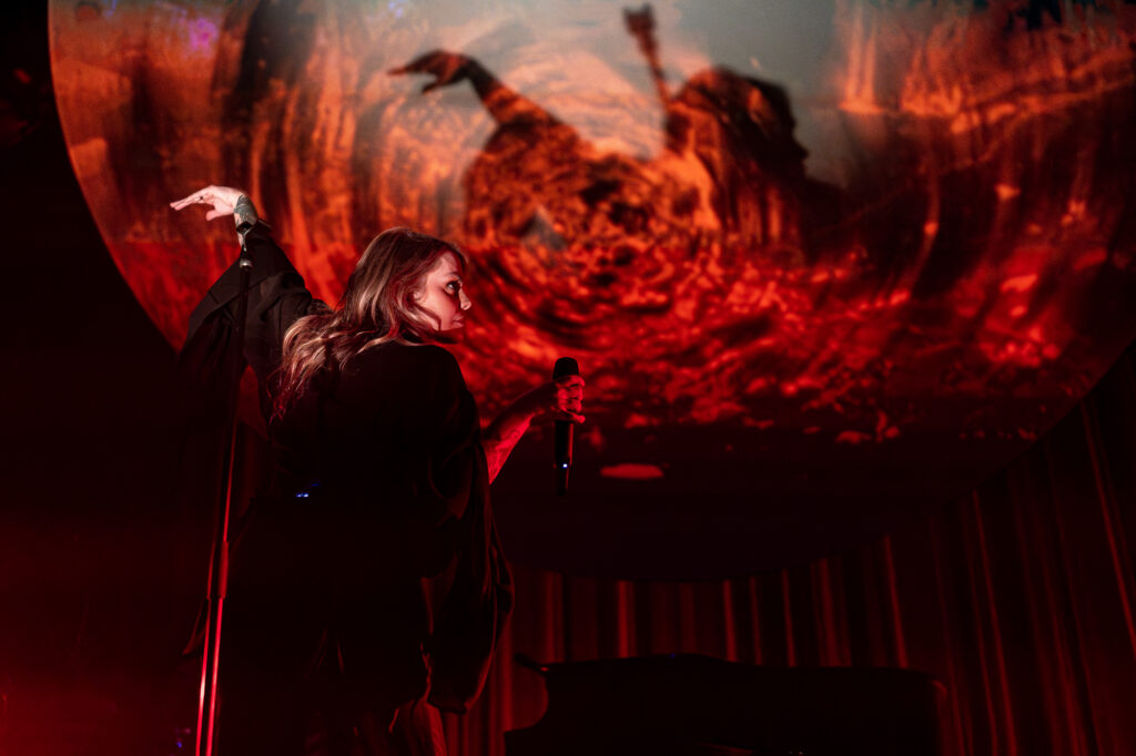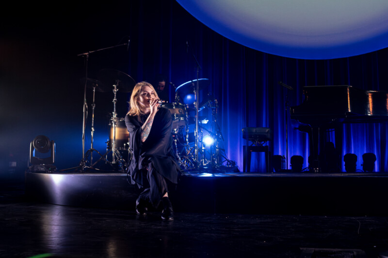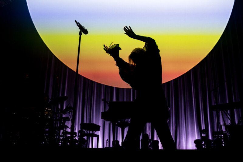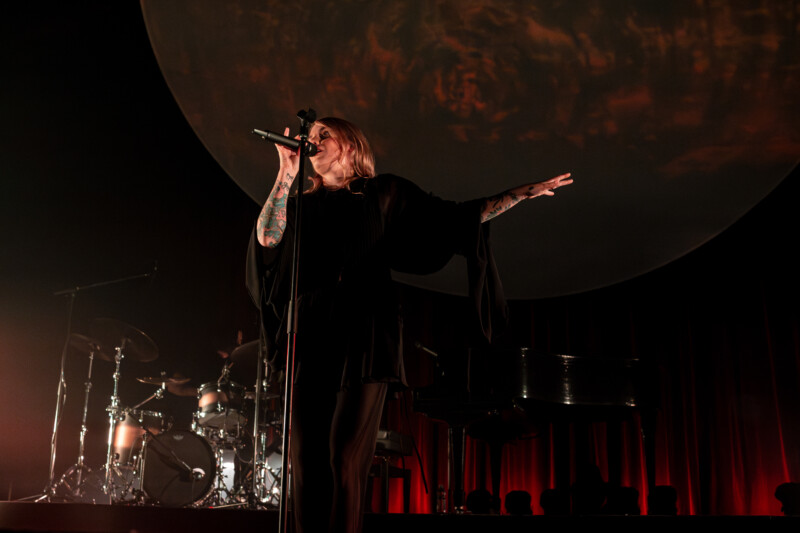 Dressed in a flowing black cloak, with her long golden hair adding contrast to the look, she shone brightly. Behind her, was what the curtain had obscured from its audience – which tallied up to but a grand piano, a drum set hidden in the darkness and the occasional shadowy outline of a session musician – and a giant circular projector screen that often looked as if a full moon had come down for the night sky to aluminate this wonder performance.