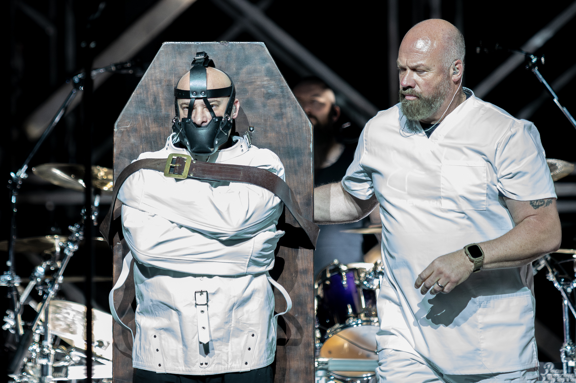 Building up the anticipation appears to be something that Disturbed are rather good at, as prior to starting their set, they played a series of video clips across a large curtain that was doubling as a projector screen. These were clips from years past, showing the band in various stages of their career in a cool little montage. Following that, the boys could be seen as shadows hidden behind this same giant white curtain, until it eventually lifted and the group got underway, with fireworks bursting off an elaborate set up behind them.