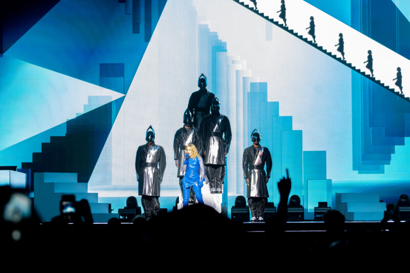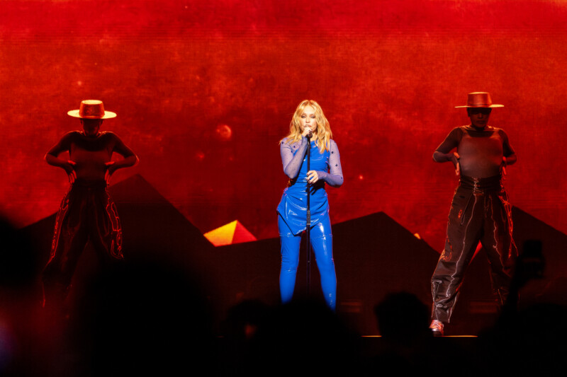 Minogue had a look for all the eras, from sexy latex numbers to sparkle and shine catsuits. Exuding glamour with a touch of party chic. Her dancers scaled it up a notch too, changing from the fabulous eighties to creating a dystopian future atmosphere. Blending fashion avantgarde, stage props, all on this catwalk-esque stage. Risers featuring a live band and back up singers interchanging as it morphed with the progression of songs.