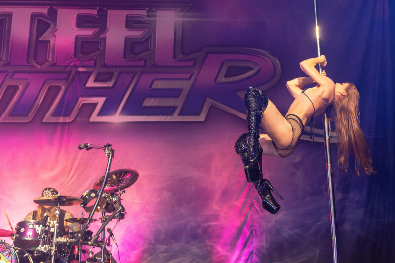 Oh, right! I guess I should explain – so, Steel Panther walked onto the stage to begin playing, and with them came two stripers, one at either side of the stage who climbed up onto stripper poles and did their thing while the band did theirs. I thought to myself, this.. is… great. More bands should do this.