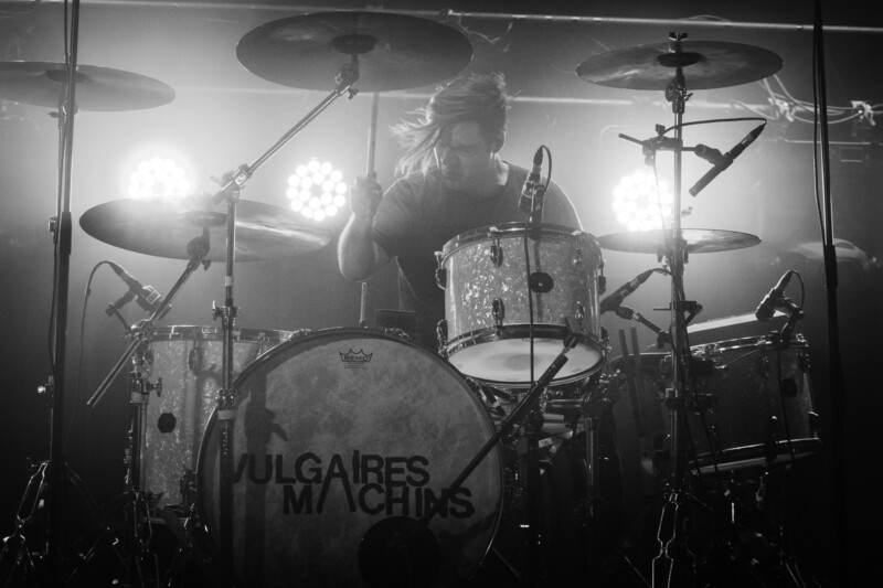 One of the guys points to his friend and tells me: “He’s got cut out interviews of Vulgaires machins on his wall. He really, really loves this band!” Silently, the aforementioned friend smiles and nods to me, in acquiescence of this personal fact. Almost everyone in the front row dutifully wears a Vulgaires Machins shirt.